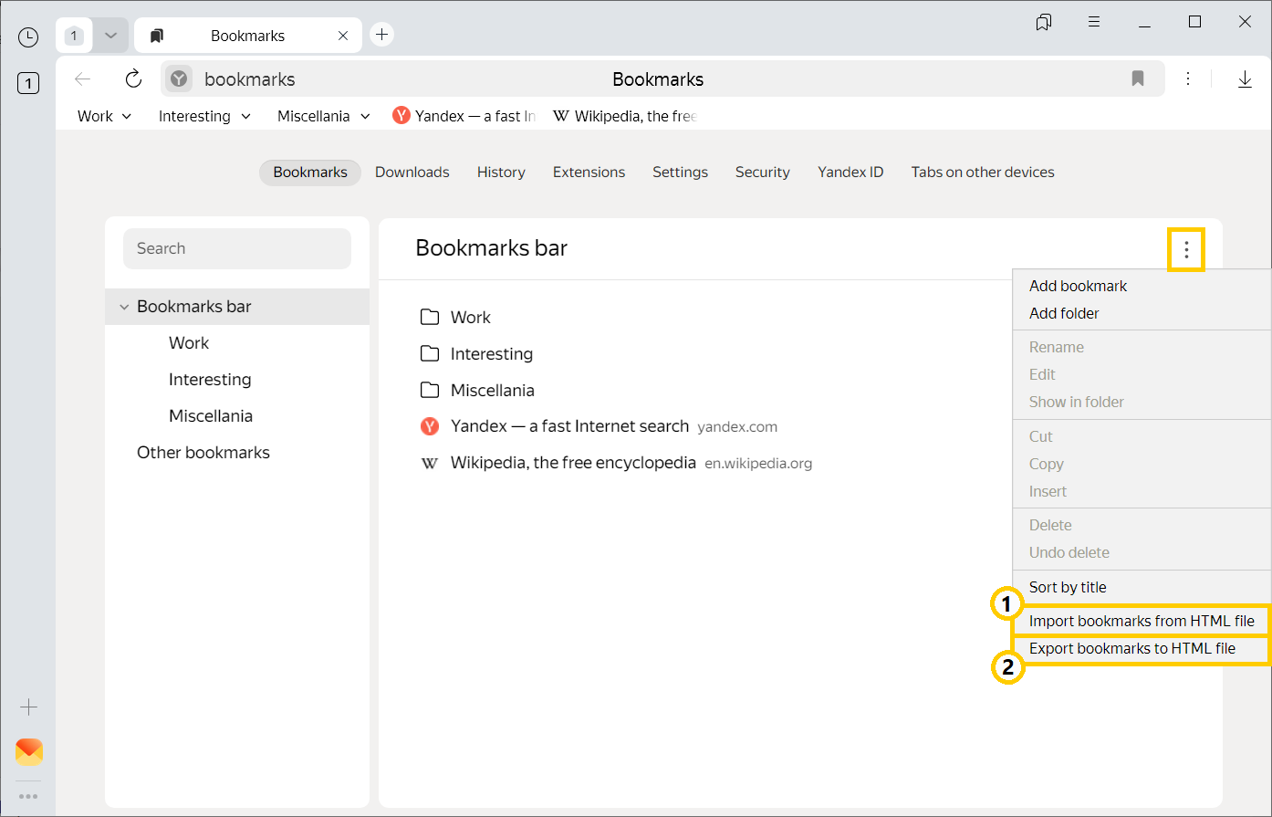 - to the root of the bookmark tree, if there were no bookmarks in Yandex Browser.