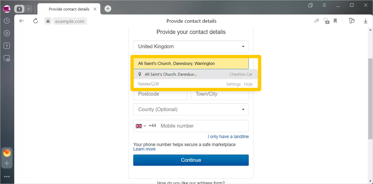 When you first enter information (such as name, address, or phone number) in the site form, Yandex Browser remembers it. The next time you enter it, the browser suggests autofill options. This way, Yandex Browser saves you time.