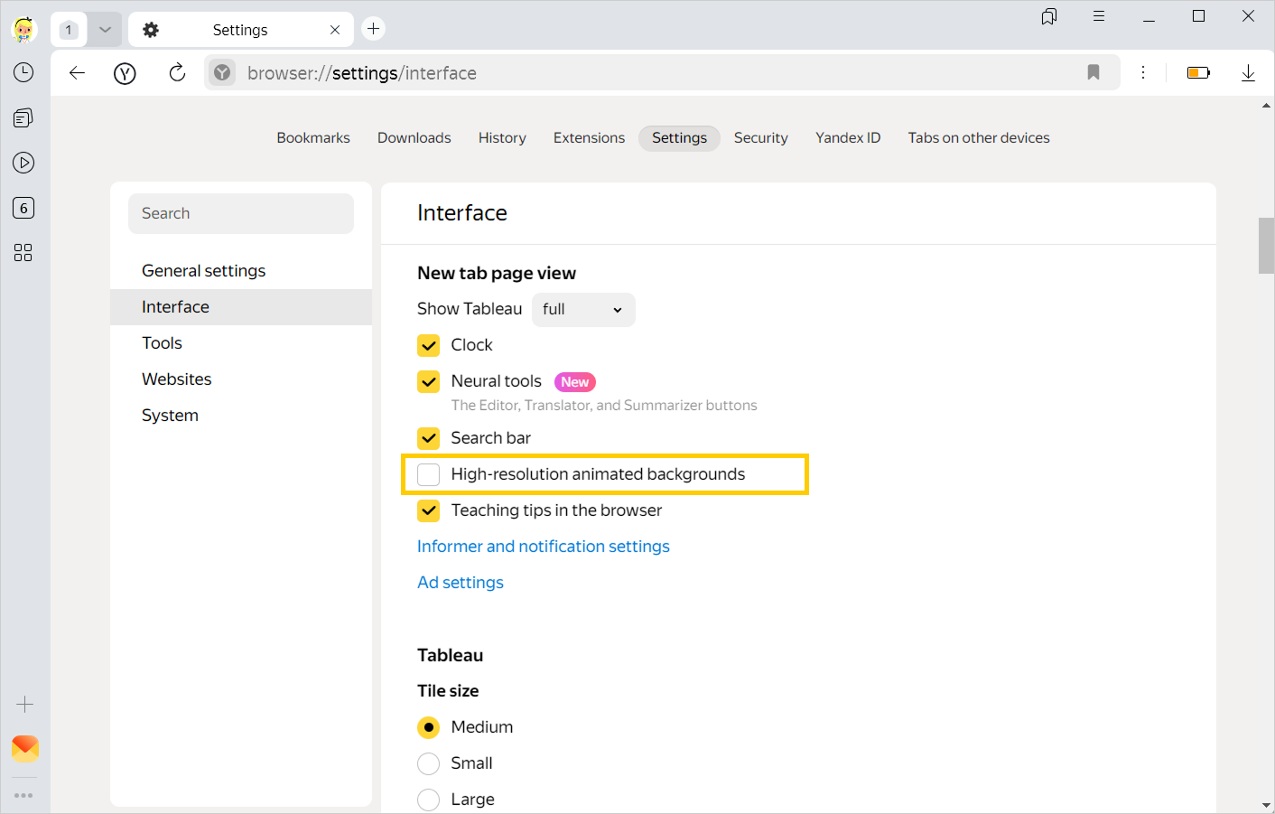 Animations playback in high resolution by default. If it causes Yandex Browser to work slower, set the standard animation quality: