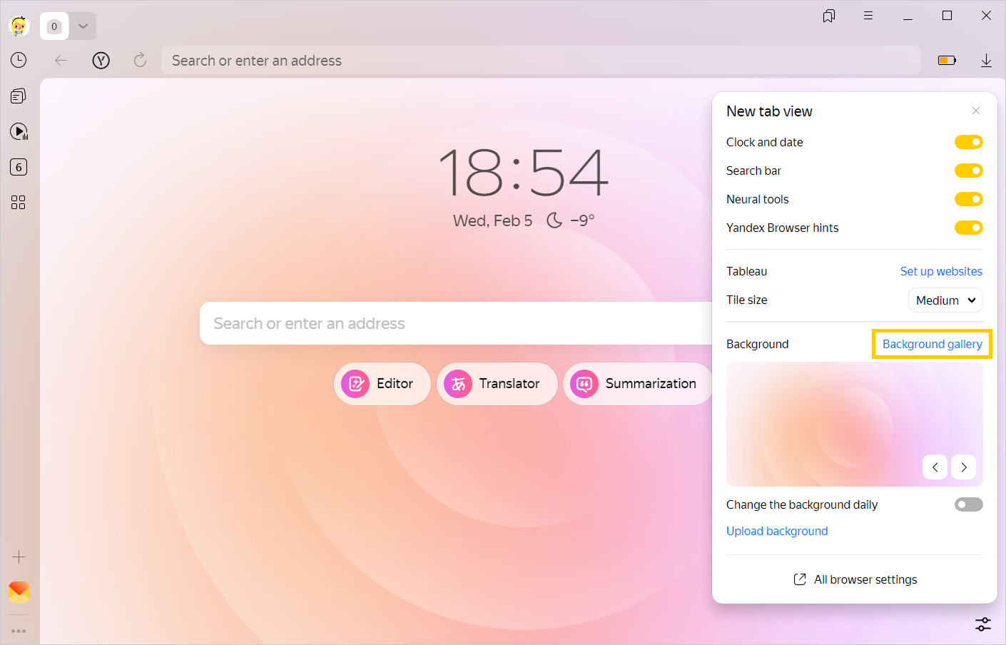 You can configure the browser to randomly alternate images or videos from your Background gallery every 24 hours.