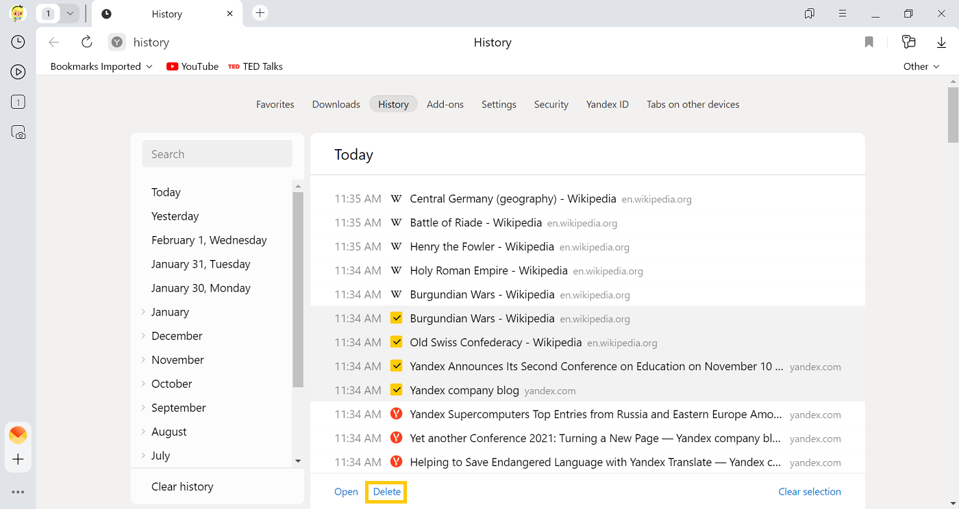 To find the desired page in the history, enter part of its name or address in the Search field. To the right, you will see a list of pages matching the search query.