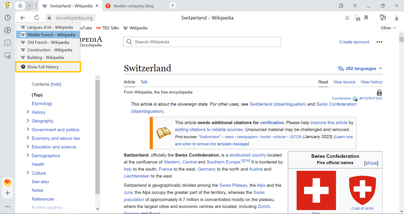 The tab history contains the last 12 pages that were open. If you don't find the page you are looking for on the list, go to your entire history. The entire history contains sites that you visited in the last 90 days. If you need the site for a longer period, save it in your bookmarks.