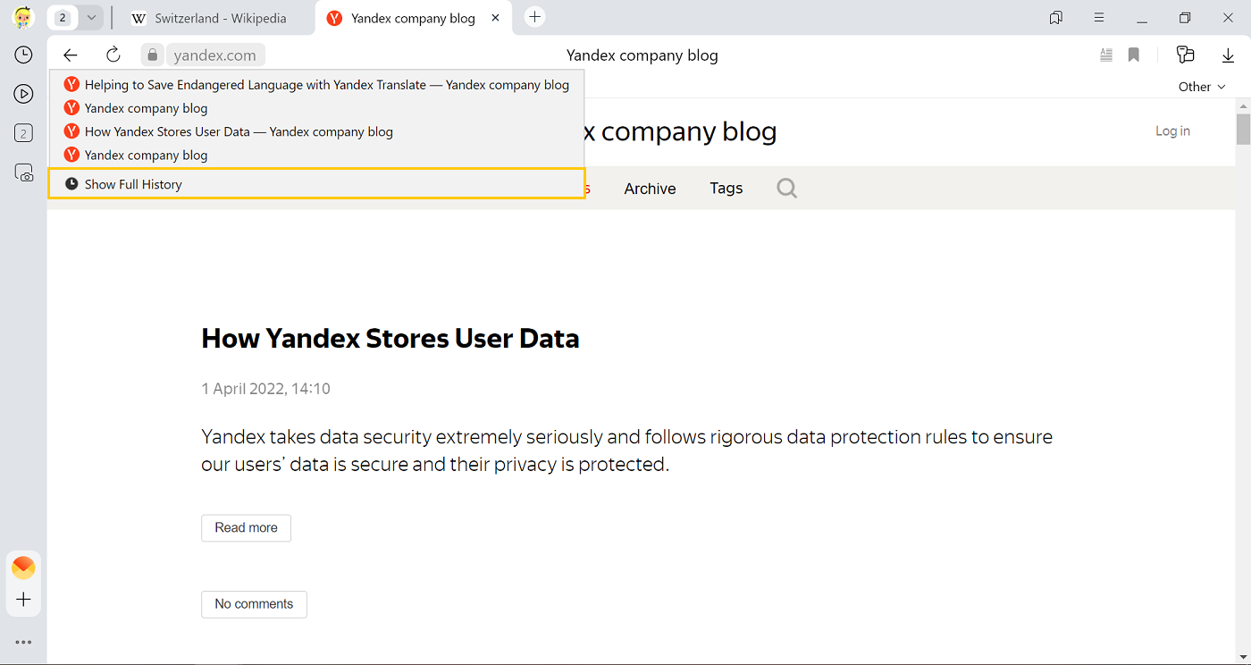 • The history of pages that the user visited on other devices is not displayed in the Yandex Browser interface. However, if after syncing you start entering the address for a site that you visited on another device, the address will appear in your search suggestions. Sites pinned to the Tableau are an exception to this rule.