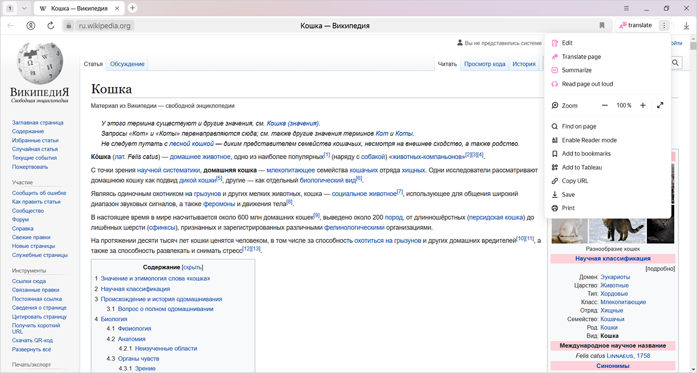 Yandex Browser will prompt you to translate the page if its language is different from your interface language. You can access Yandex Translate or translate specific words, images or videos using the context menu.