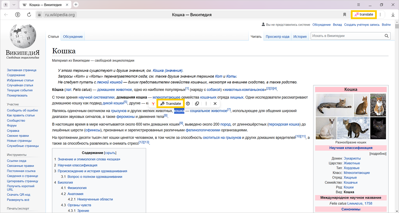 The Browser can translate separate words and sentences on the page to English. To see the translation of a word or phrase, select it and click Translate in the context menu. A pop-up with the translation will appear on the page.