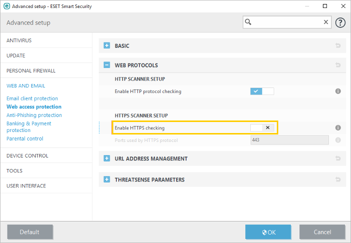 Disable HTTPS connection tests in the ESET NOD32 antivirus