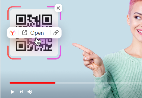 Yandex Browser can recognize QR codes on videos and display their contents. Browser highlights the QR code with a colored frame and shows the options to follow or copy the link.