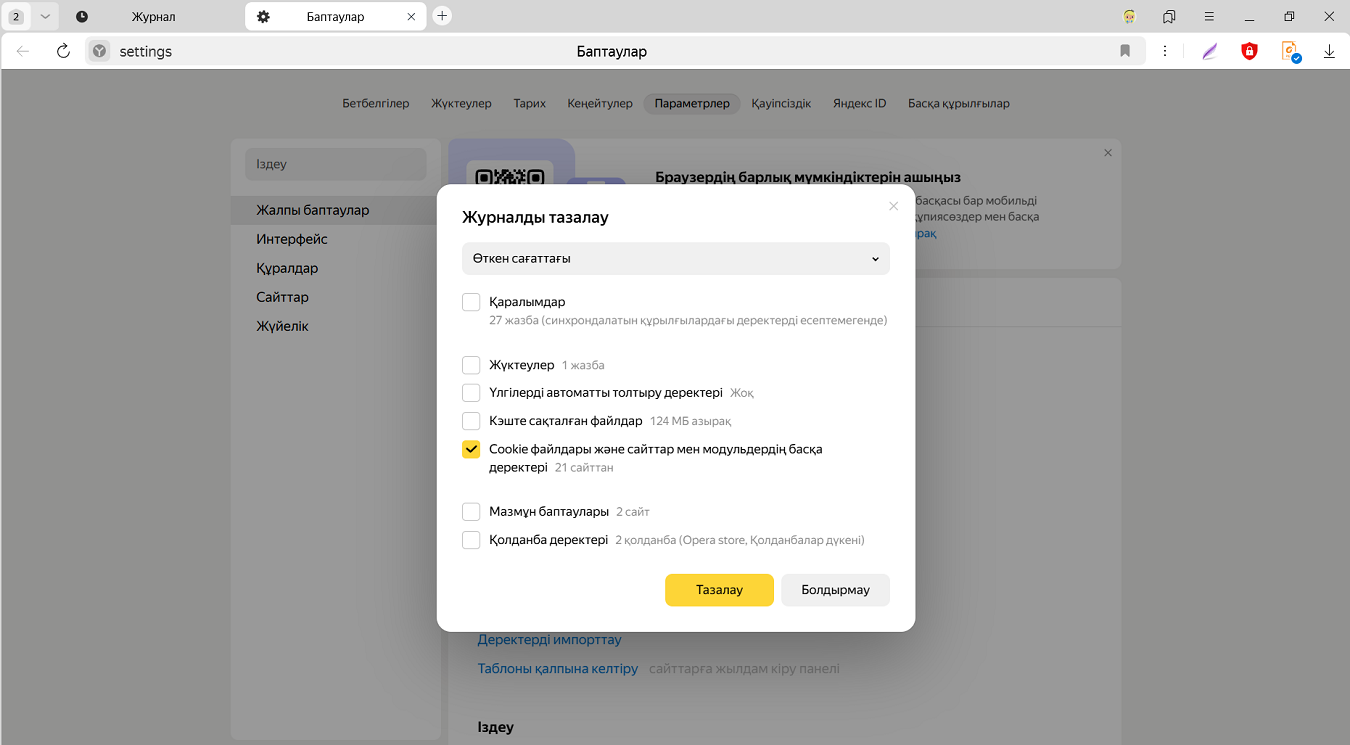 Әдепкі бойынша Яндекс Браузерінде cookie файлдарын сақтауға рұқсат етіледі.