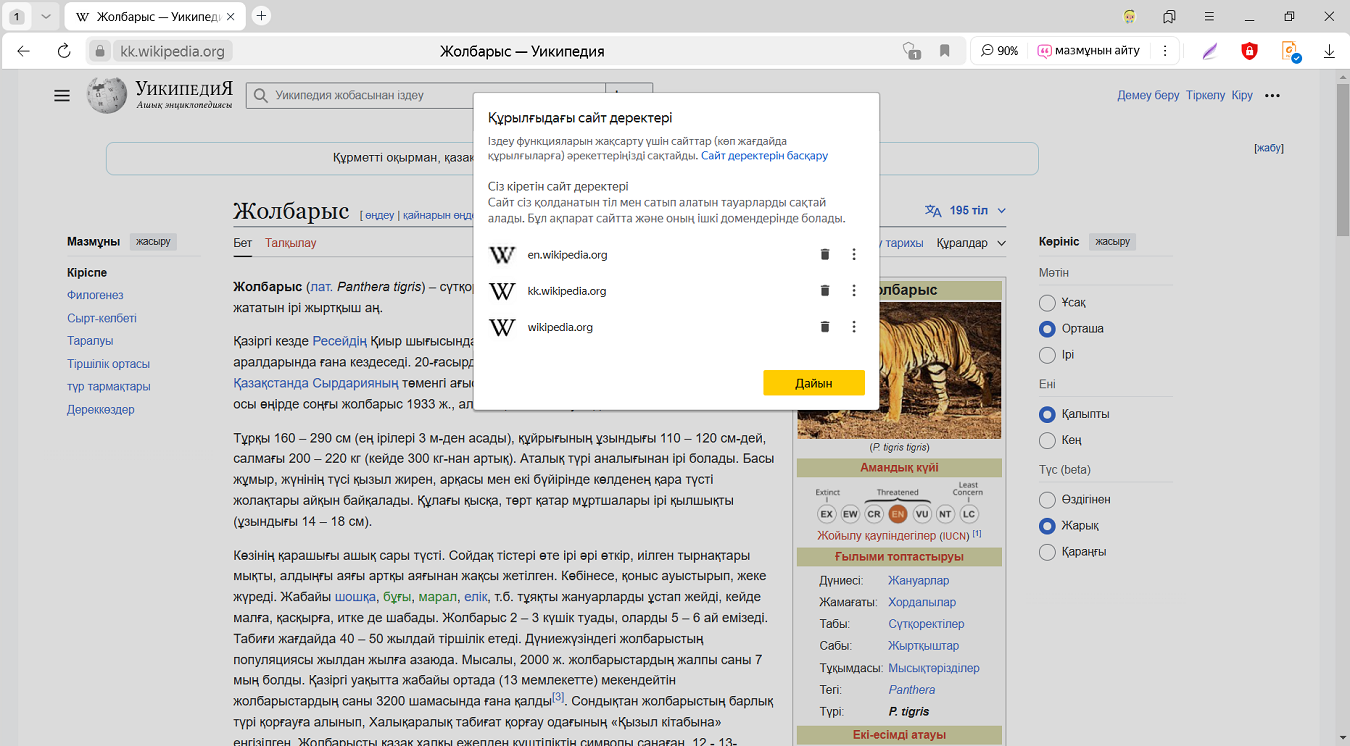 Әдепкі бойынша, барлық сайттарға cookie сақтауға рұқсат етіледі.
