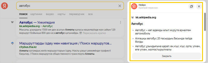 Мәтіннің қысқаша мазмұндамасын алу үшін іздеу нәтижелеріндегі сайттың жанында тұрған Қысқаша мазмұндау батырмасын басыңыз.