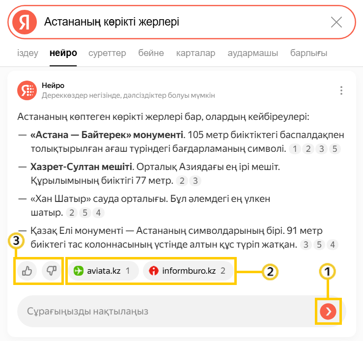 1. Сұрауды нақтылай аласыз. Көбірек мәлімет қосыңыз немесе нақтылаушы сұрақ қойып,  басыңыз. Оған қоса, Нейро алдыңғы сұраудың мәнмәтінін ескеріп отырады.