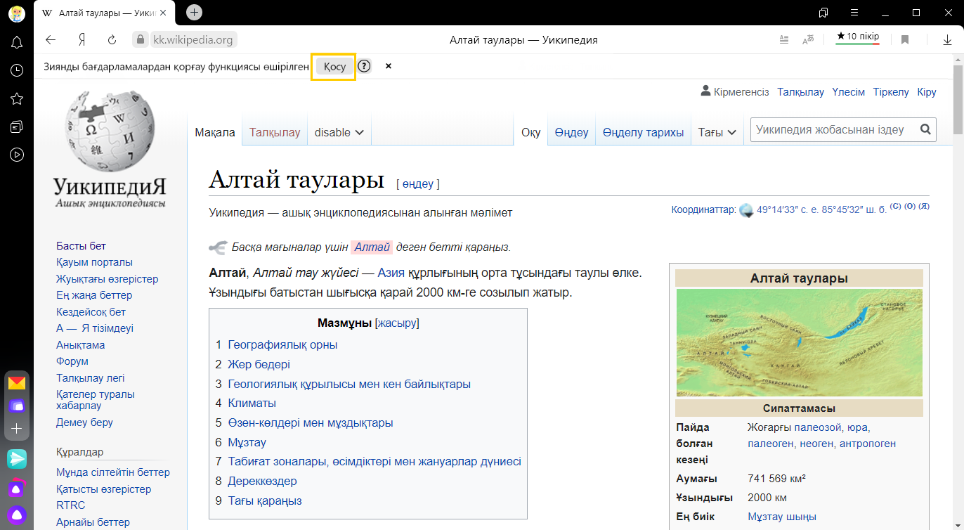 Яндекс Браузерде зиянкес бағдарламалық жасақтамадан қорғау қосылған, ол науқас сайттар мен парақшаларды бұғаттайды. Бұл қорғауды өшіруге болады.