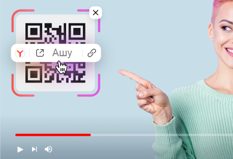 Яндекс Браузер видеодағы QR-кодтарды ажыратып, олардың мазмұнын көрсете алады. QR-кодта түрлі-түсті жиектеме мен сілтеме арқылы өту немесе көшіріп алуға арналған батырмалар пайда болады.