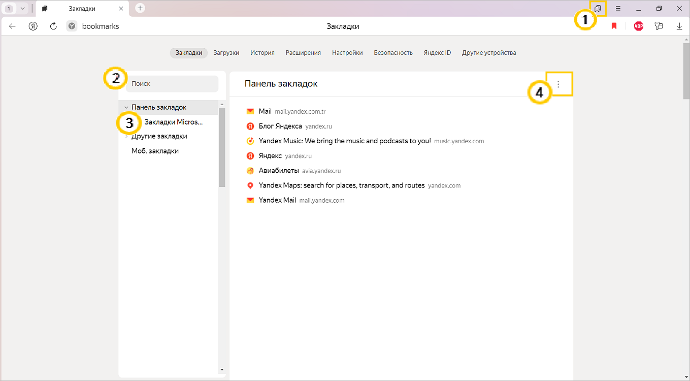 Закладки автоматически сохраняются в вашем аккаунте, который привязан к Яндекс ID, и доступны на всех ваших устройствах. В меню слева появятся папки с названием устройства (например, Смартфон или Планшет). Подробнее см. раздел Сохранение закладок.