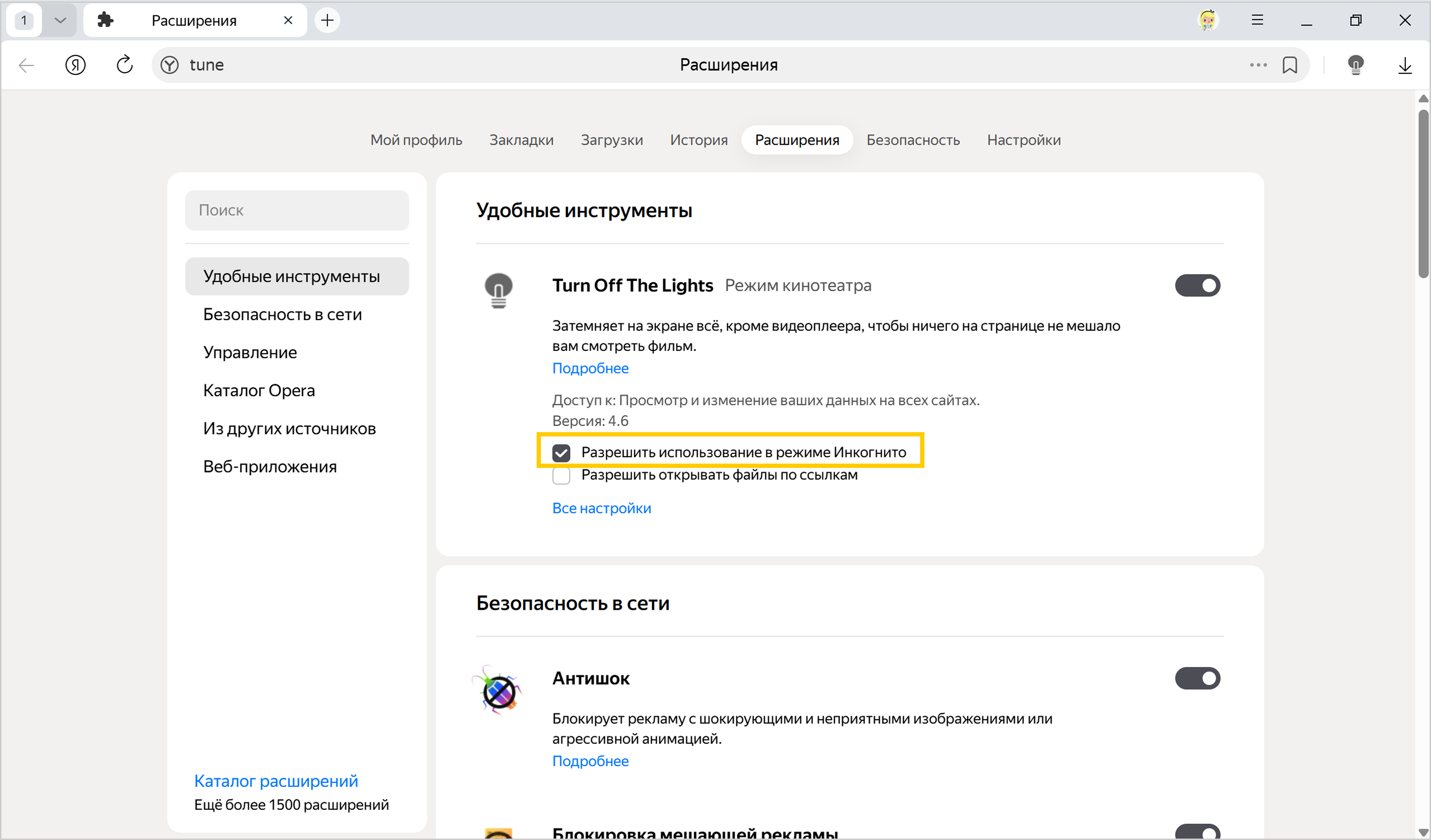 Расширения в режиме Инкогнито