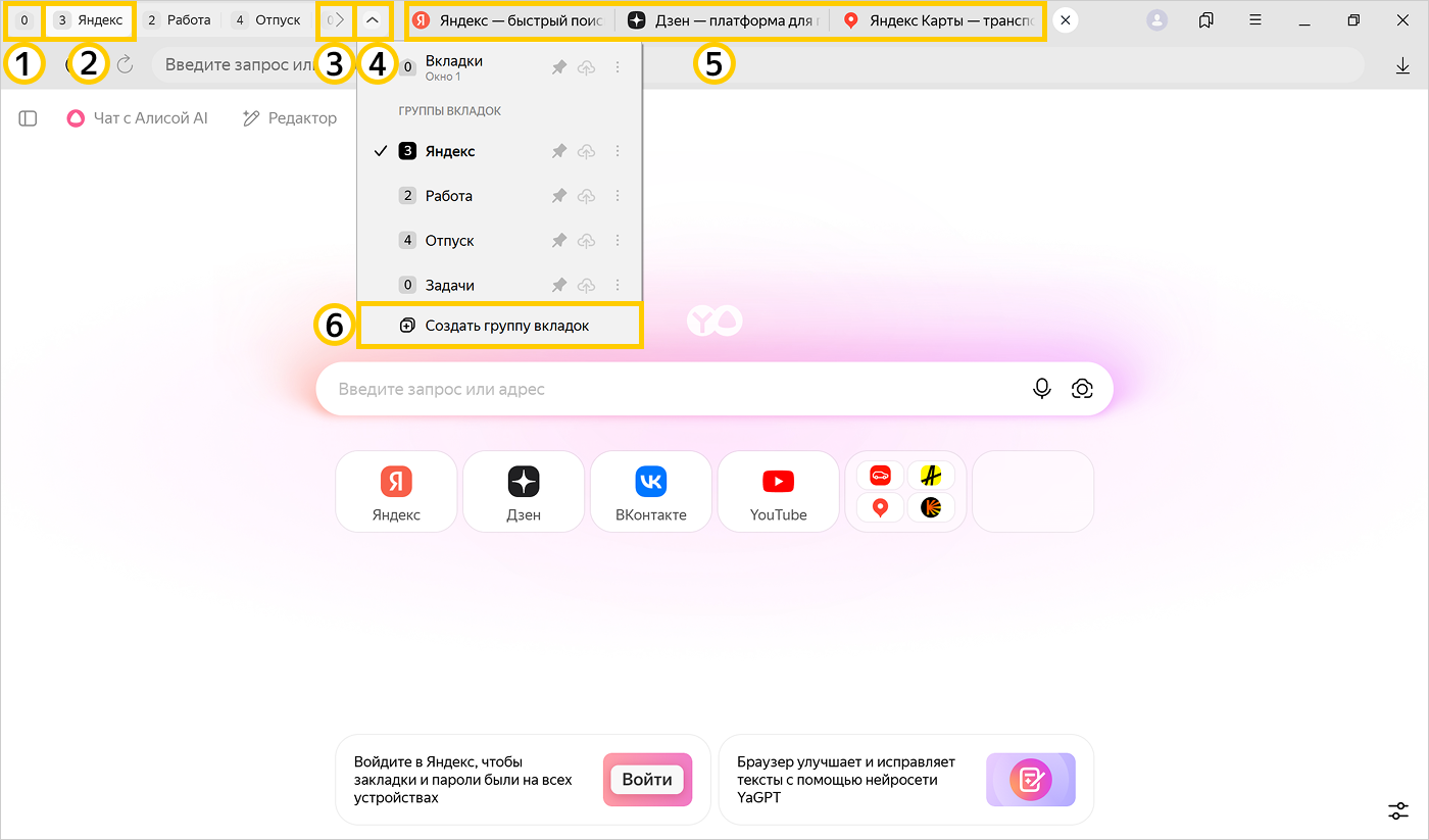 1 — вкладки окна — здесь остаются вкладки, не помещенные ни в одну из групп;