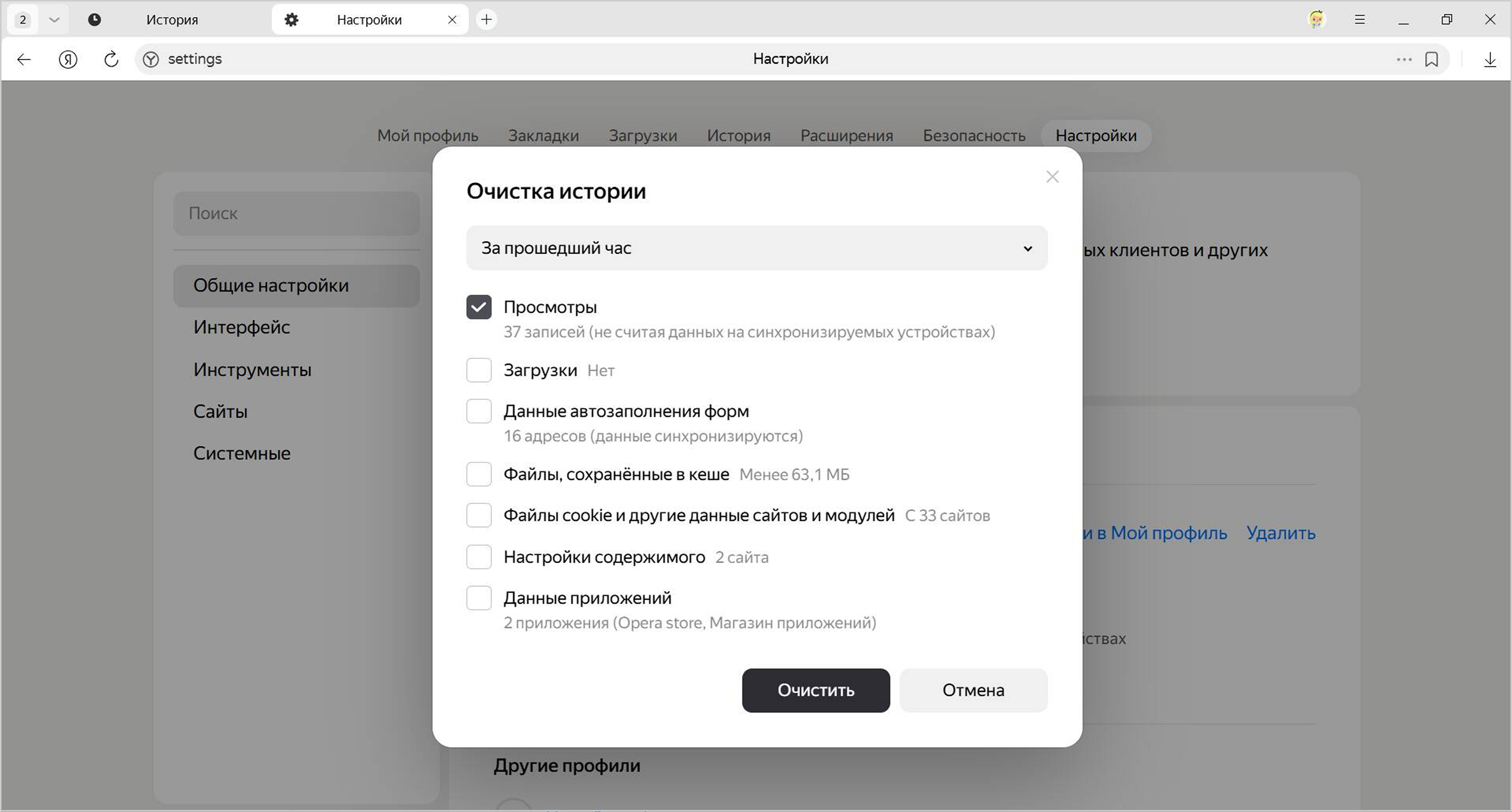 Открыть инструмент очистки истории, кеша и загрузок