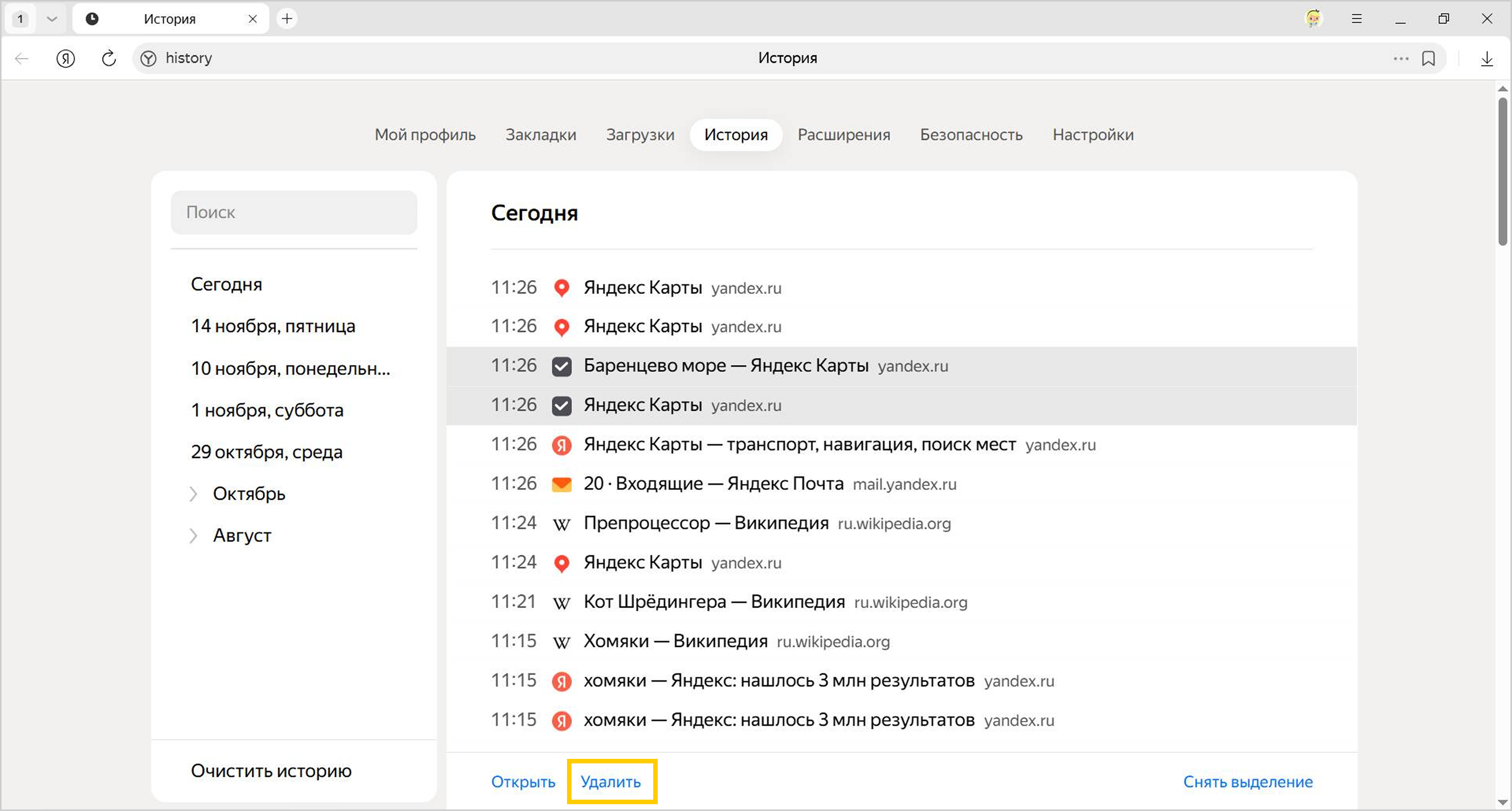 1. Нажмите Настройки Яндекс Браузера → История → Вся история.