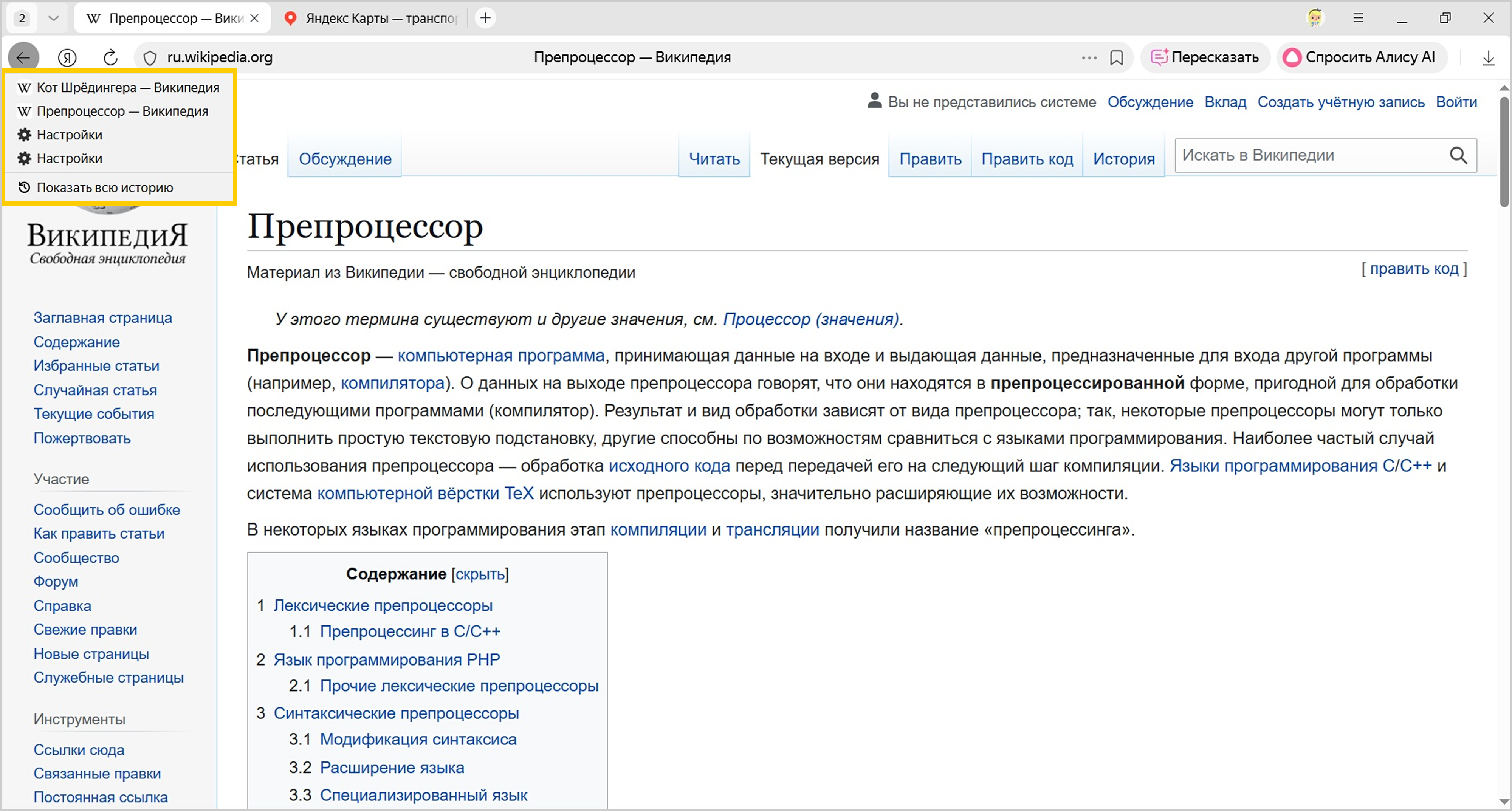 Просмотр истории вкладки