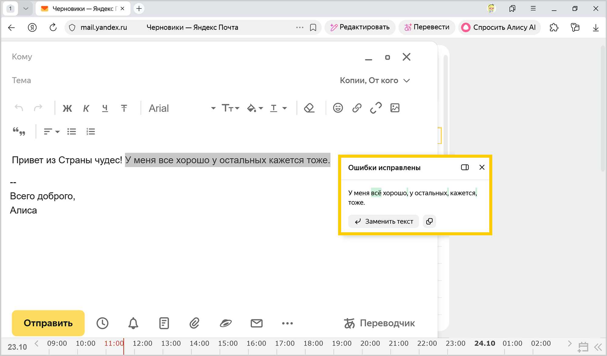 Редактор в Браузере помогает написать, отредактировать и улучшить текст, используя Алису AI. Он исправит ошибки, улучшит стиль, переформулирует или переведет текст на другой язык. Это удобно при подготовке любых текстов: от электронных писем и постов в социальных сетях до научных статей и художественных произведений.