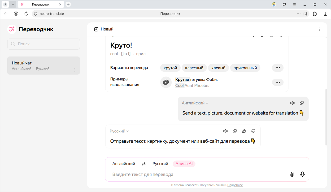 В этом режиме можно перевести текст, картинку, сайт или видео на текущей вкладке.