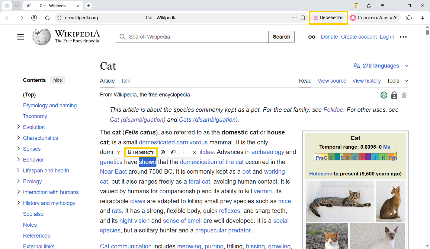 Браузер может переводить на русский язык отдельные слова или предложения на странице. Чтобы увидеть перевод слова или словосочетания, выделите их и нажмите Перевести в контекстном меню. На странице появится окно с переводом.