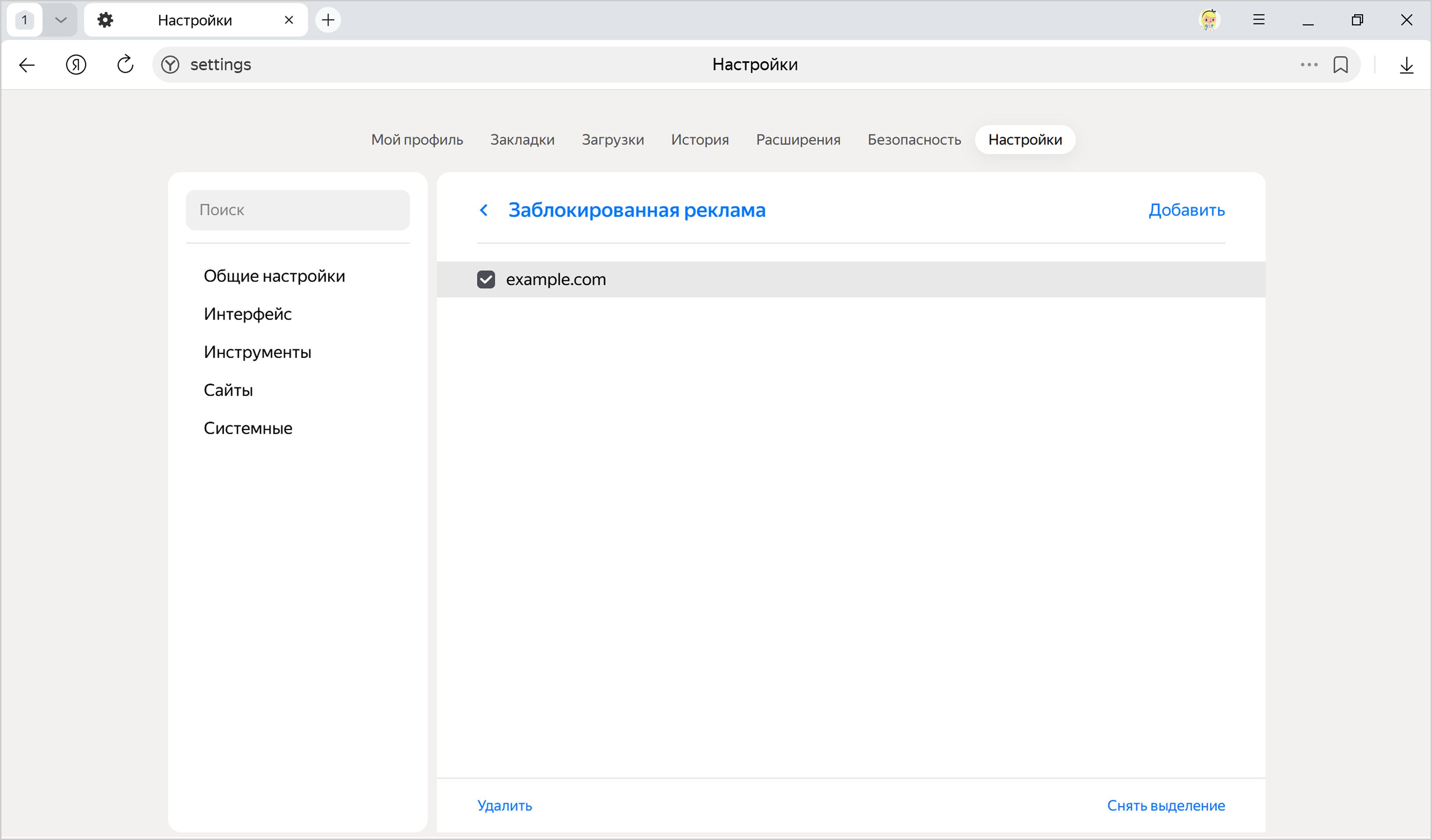 В разделе Блокировка рекламы нажмите Список сайтов-исключений.