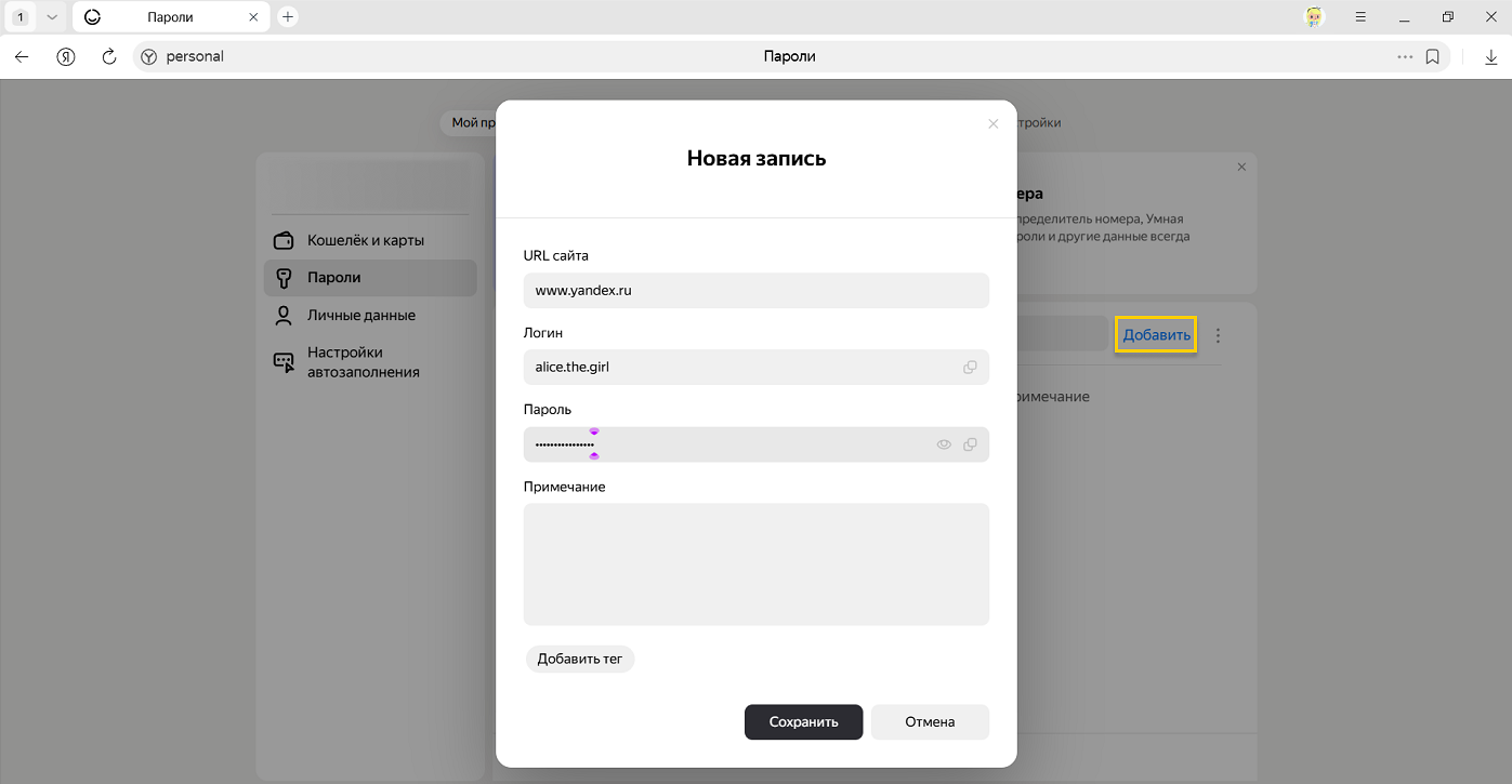В правом верхнем углу раздела Пароли нажмите Добавить.