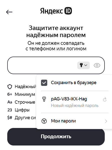 Установите курсор мыши в поле ввода пароля. Браузер автоматически предложит сгенерированный пароль.