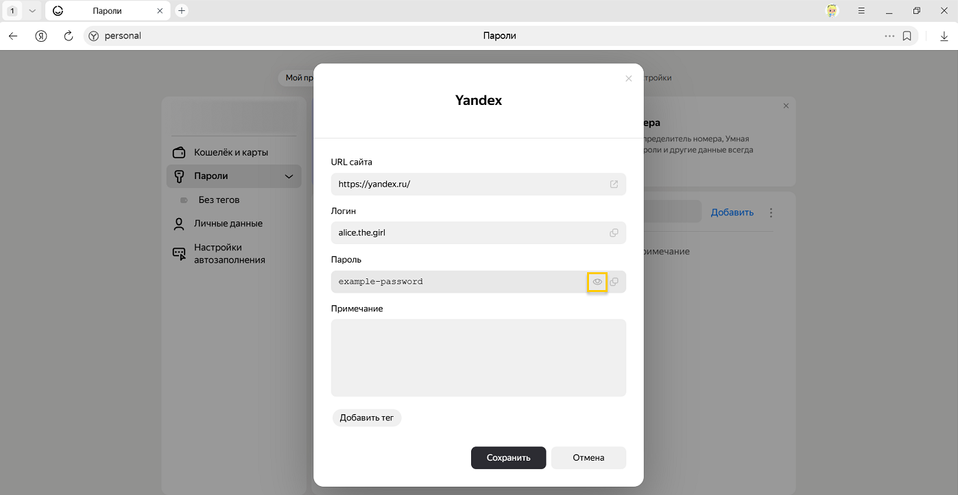 Если вы удалили пароль по ошибке, то сразу можете его вернуть. В левом нижнем углу менеджера паролей нажмите Восстановить. Если вы перезагрузите страницу или перейдете на другую вкладку, то не сможете вернуть пароль.