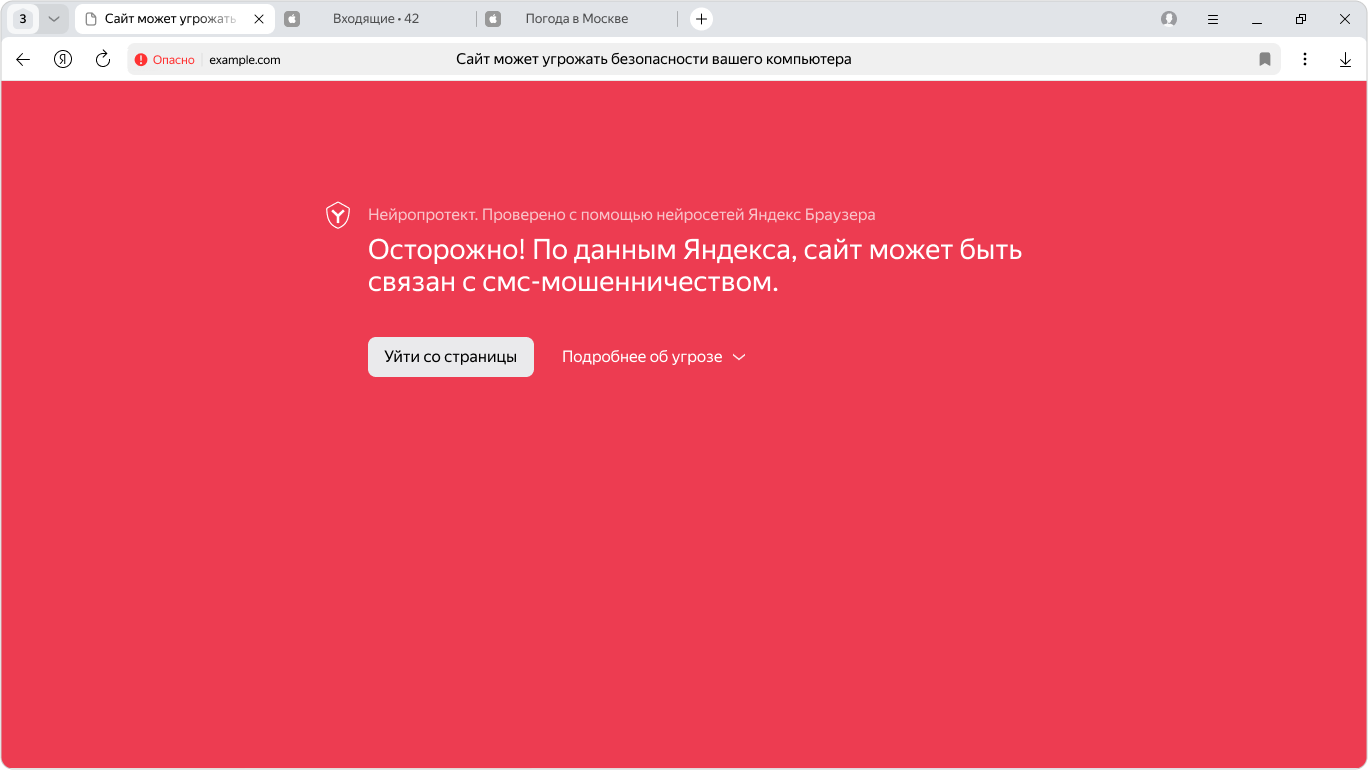 Яндекс отслеживает фишинговые сайты и ресурсы, которые, возможно, используют мошенники. Адреса таких сайтов хранятся в специальной базе данных. Если вы пытаетесь зайти на ресурс, который может быть связан с SMS-мошенничеством, Браузер заблокирует потенциально опасную страницу и проинформирует вас об этом — появится сообщение в окне Браузера и значок в Умной строке.