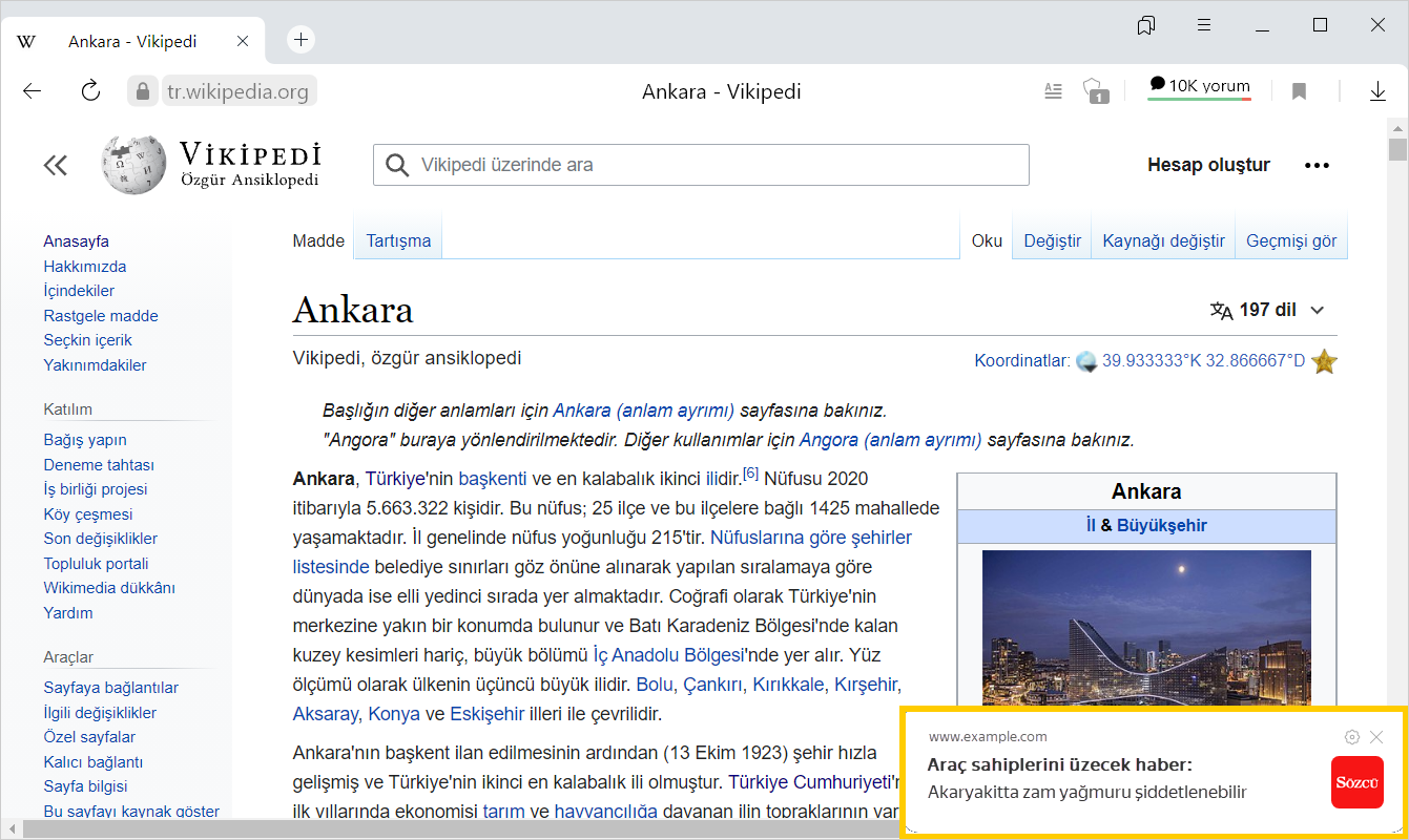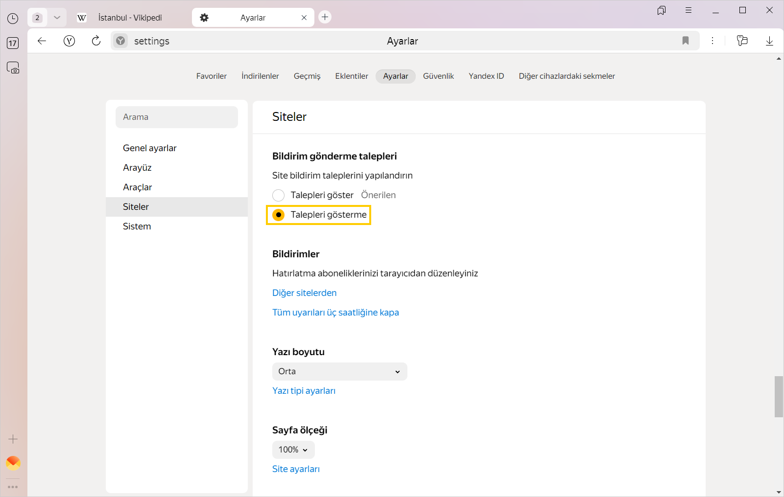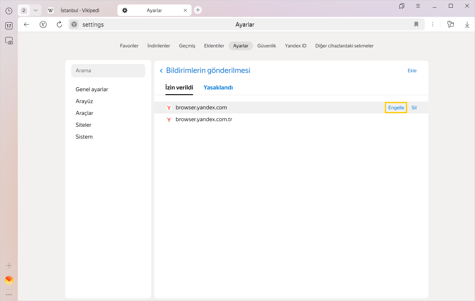 Siteler haber, yorum ve güncellemelerle ilgili bildirimler gönderebilir. Siteler bildirim göndermek için genellikle izin istemekle birlikte, bazen izinsiz de bildirim gönderebilirler. Yandex Browser'da belirli bir siteden gelen bildirimlere izin verebilir veya bunları engelleyebilir ya da tüm sitelerin bildirimlerini toplu olarak engelleyebilirsiniz.