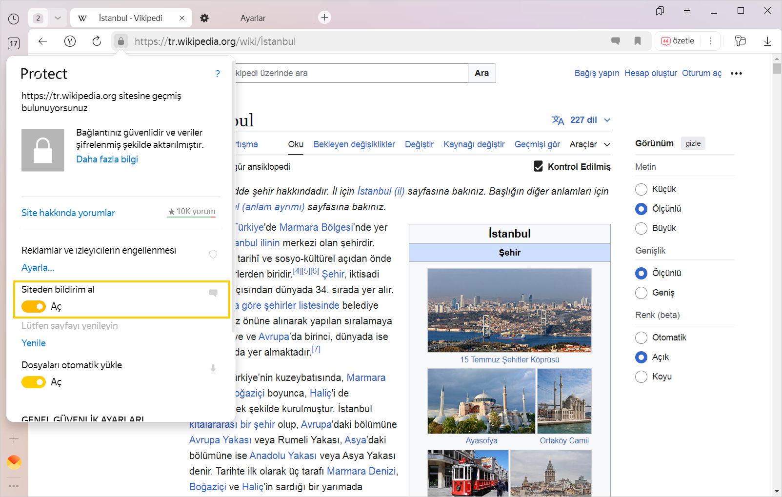 Açılan Protect panelinde Siteden bildirim al özelliğini etkinleştirin veya devre dışı bırakın.