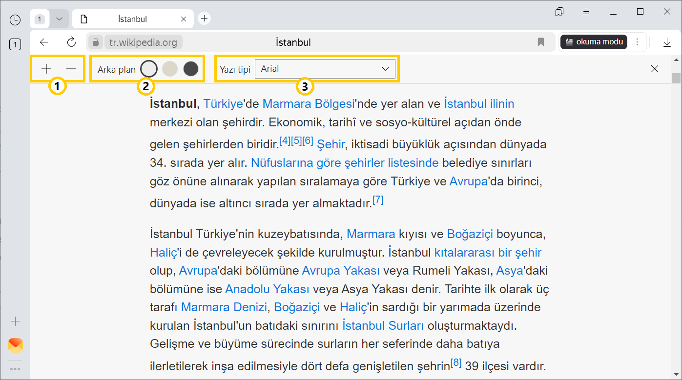 Göz yorgunluğunu azaltmak için Akıllı Satır’ın altındaki ayarlar panelinde arka plan rengini, yazı tipi stilini ve boyutunu değiştirebilirsiniz. Seçtiğiniz tasarım, okuma modunda açılan tüm belgeler için varsayılan olarak kullanılacaktır.