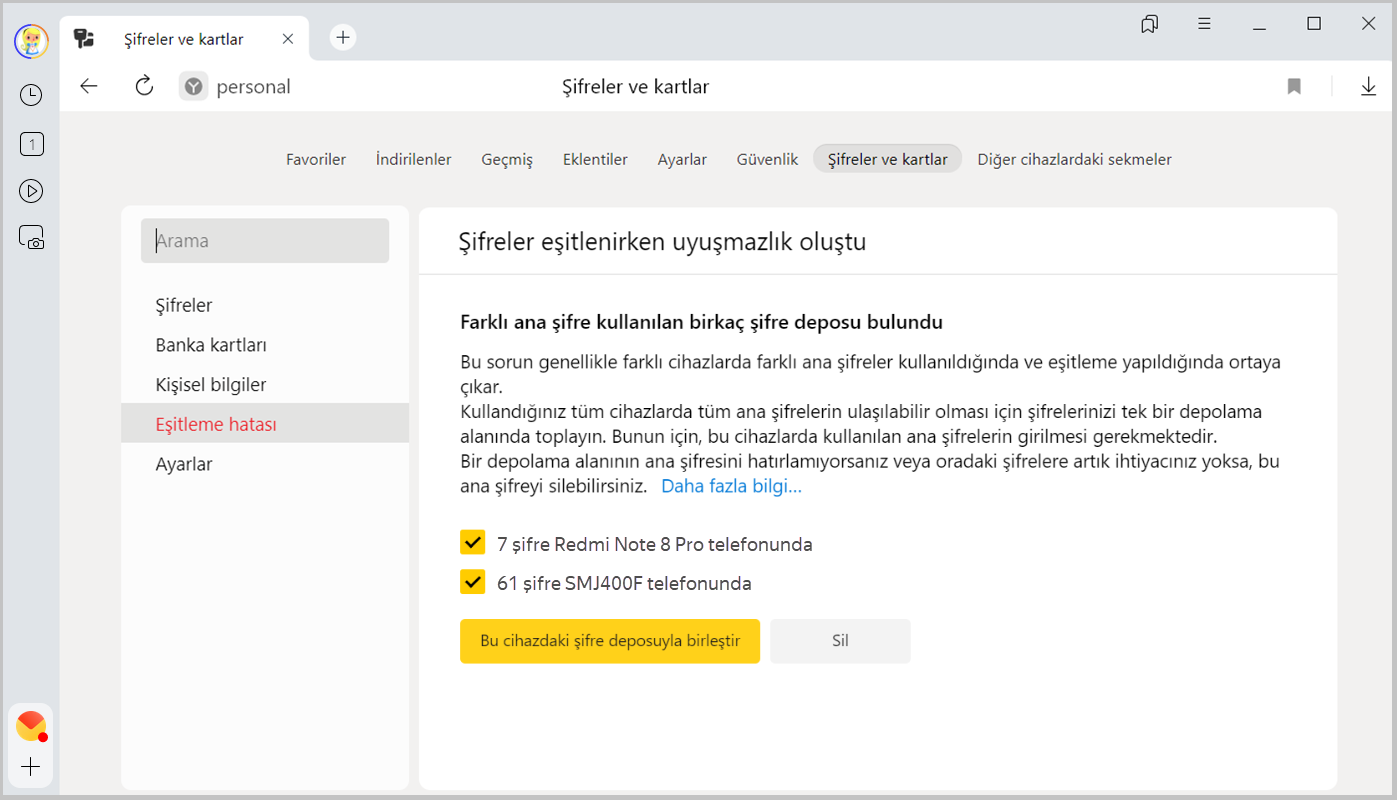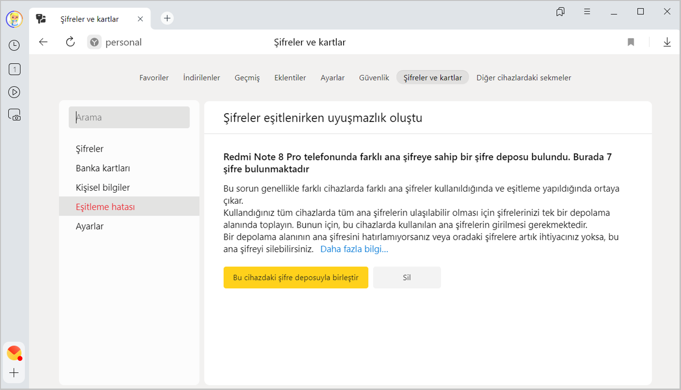 Eşitlenen cihazlardan birinde ana şifre'yi değiştirirseniz eşitlemeden sonra ana şifre diğer cihazlarda da değişir. Eşitlenmemiş bir cihazda ana şifreyi değiştirirseniz veya eşitlenmeden önce cihazlarda farklı ana şifreler oluşturursanız şifrelerle ilgili çakışma ortaya çıkacaktır. Örneğin, akıllı telefonda bir ana şifre, bilgisayarda ise başka bir ana şifre girdiğinizi ve ardından eşitlemeyi etkinleştirdinizi düşünelim. Bu tür durumlarda Yandex Browser, birleşik depoyu şifrelemek için hangi ana şifreyi kullanacağını anlayamaz.