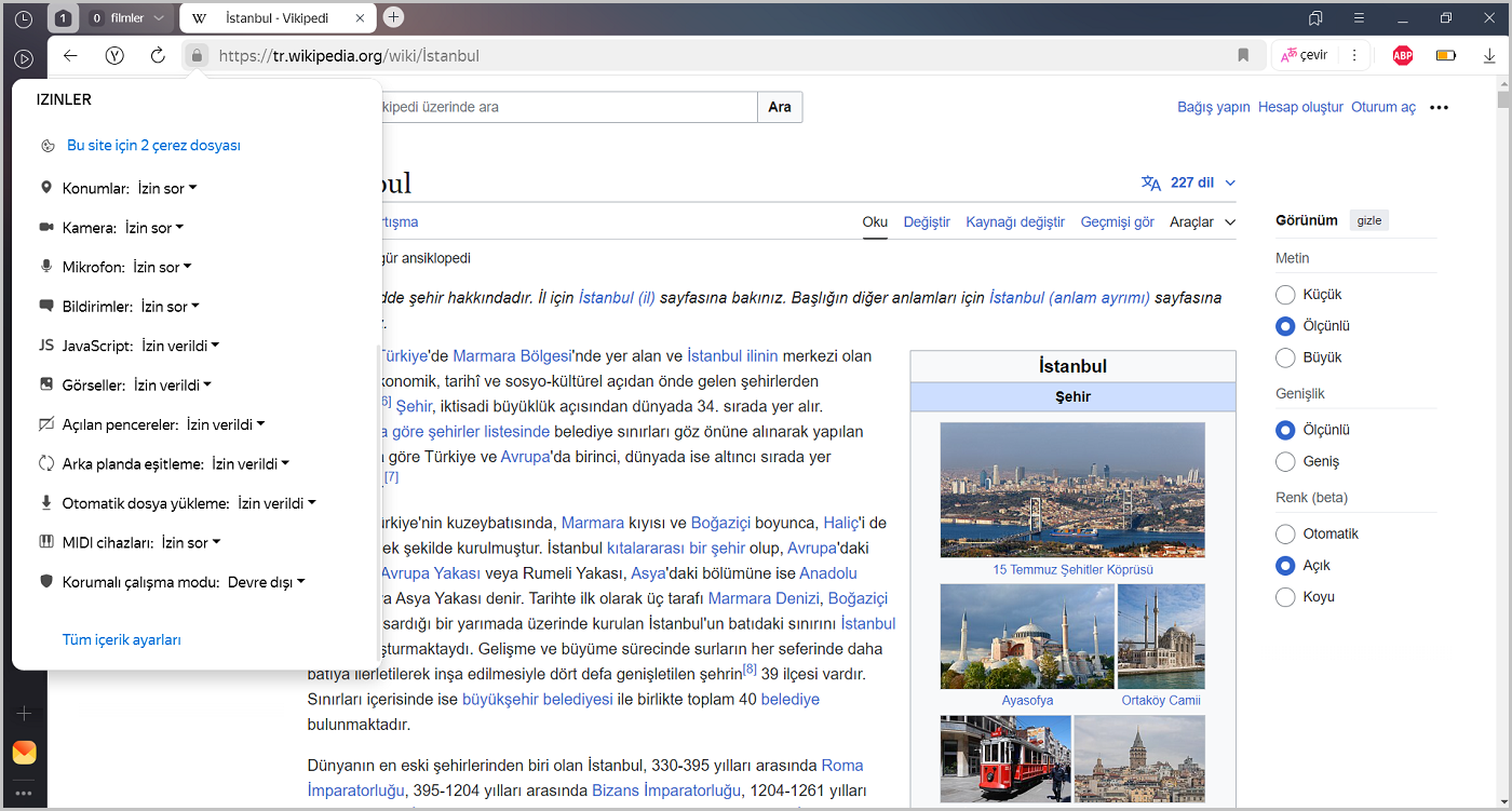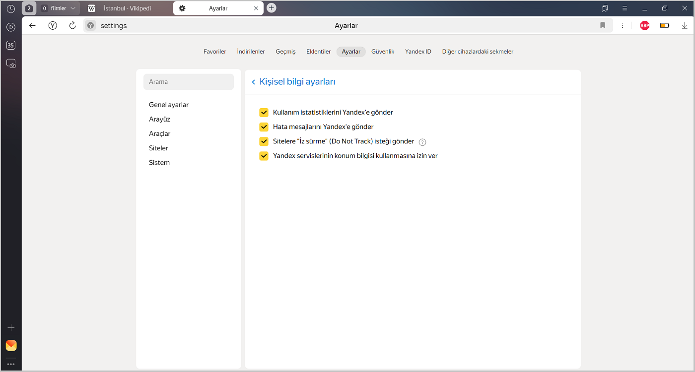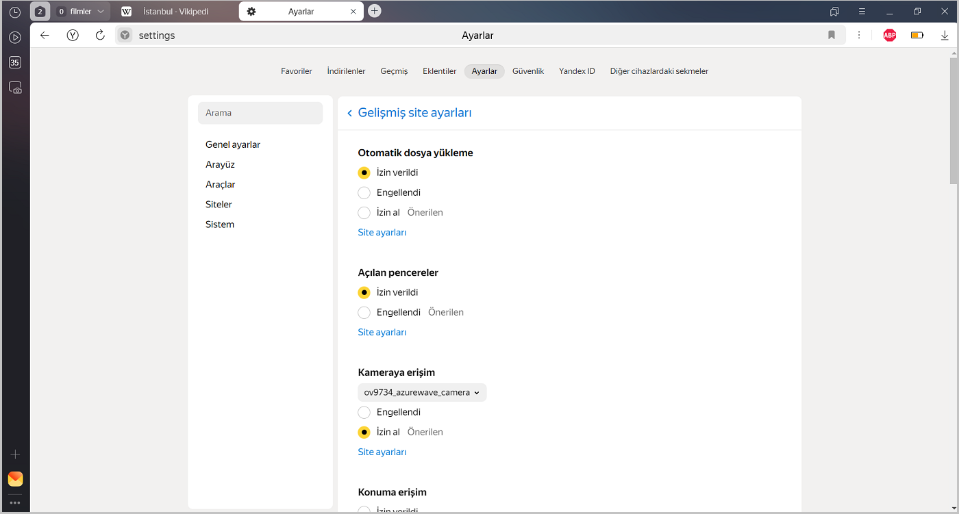 İnternette daha güvenli ve rahat gezinmeniz için Yandex Browser, ziyaret ettiğiniz sitelerin bazı öğelerini belirli şekillerde işler. Açılır pencereleri engeller, bir sitenin konum talebi vb. ile ilgili uyarıda bulunur. Protect paneli yardımıyla veya ayarlardan Yandex Browser’ın tüm sitelerdeki veya seçilen bir sitedeki davranışını değiştirebilirsiniz. Örneğin, tüm sitelerde JavaScript çalıştırmayı yasaklayabilir veya belirli bir site için kameranıza erişim izni verebilirsiniz.
