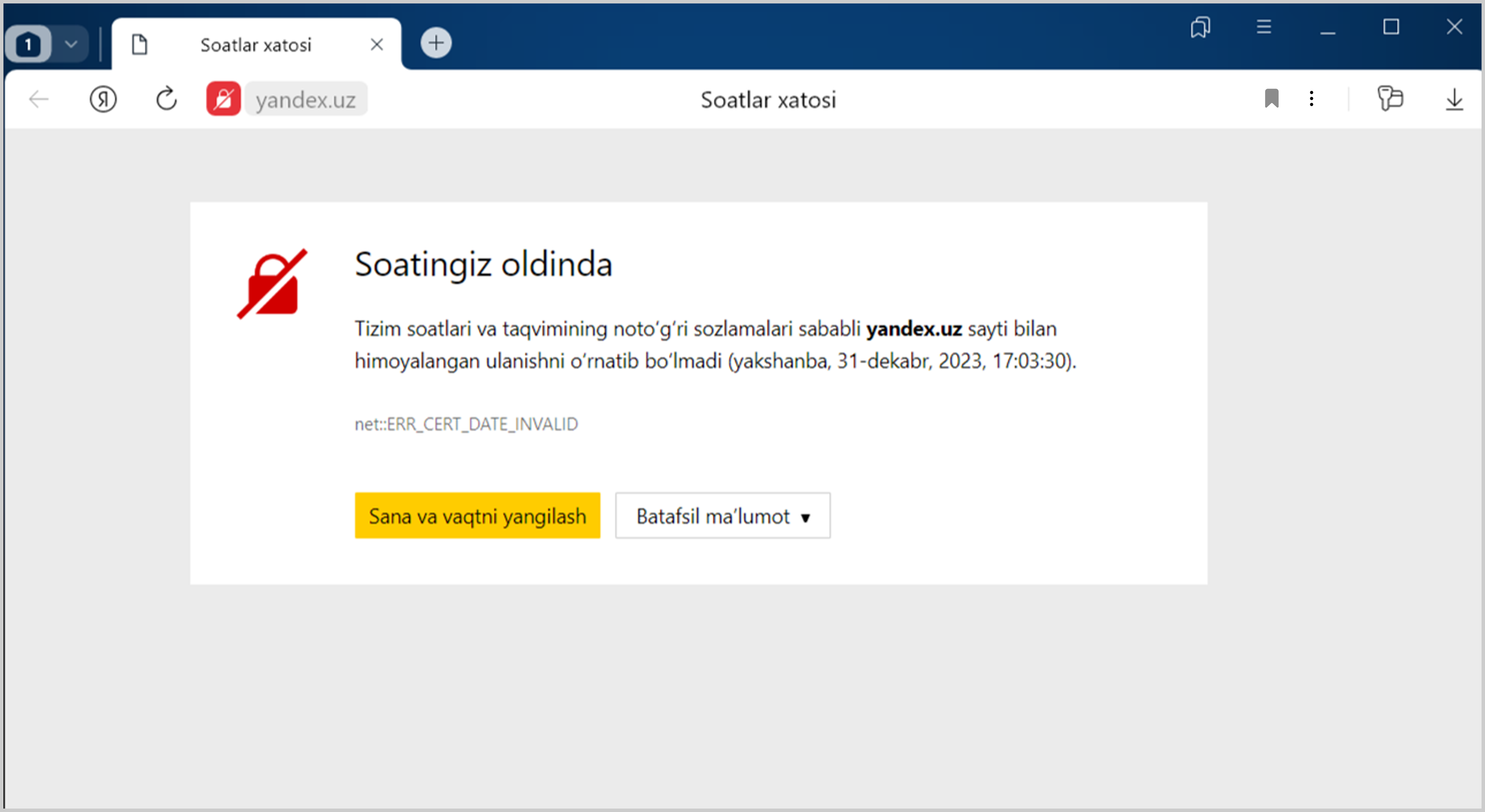 Sayt bilan ishlashni davom ettirish uchun Sana va vaqtni yangilash tugmasini bosing. Ochilgan tizim sozlamalarida to‘g‘ri sana va vaqtni o‘rnating, keyin brauzerda sahifani yangilang.