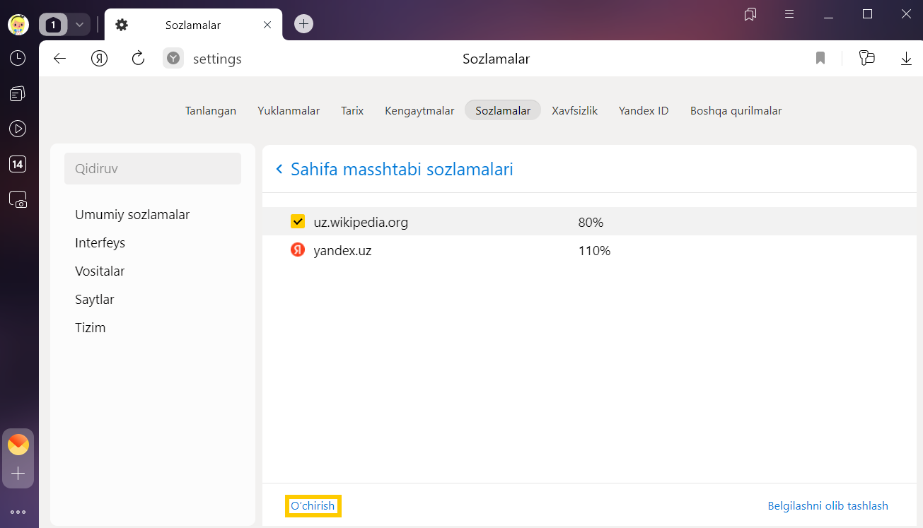 O‘zgartirilgan masshtab haqidagi ma’lumot Yandex.Brauzerda saqlanadi. Qayta ochilganda, sahifa siz tanlagan hajmda ko‘rsatiladi.