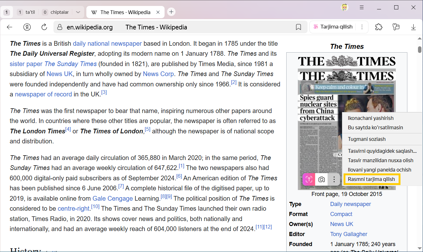 Agar rasm juda kichik boʻlsa, tarjimon tugmasi aks etmaydi. Tasvirga sichqonchaning oʻng tugmasi bilan bosing va ochilgan menyuda Rasmni tarjima qilish parametrini tanlang.