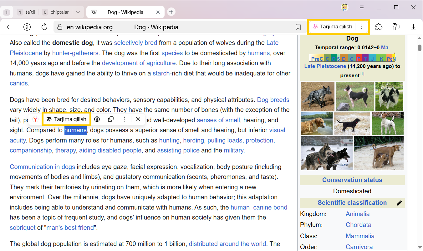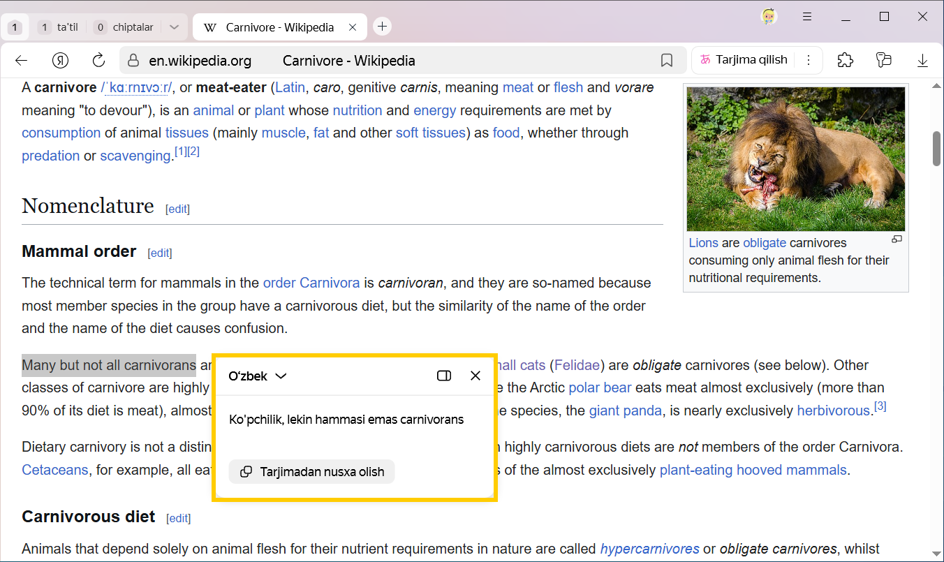 Brauzer sahifadagi alohida so‘z yoki jumlalarni rus tiliga tarjima qilish mumkin. Soʻz yoki iboraning tarjimasini koʻrish uchun ularni belgilang va kontekst menyusida Tarjima tugmasini bosing. Sahifada tarjima oynasi paydo boʻladi.