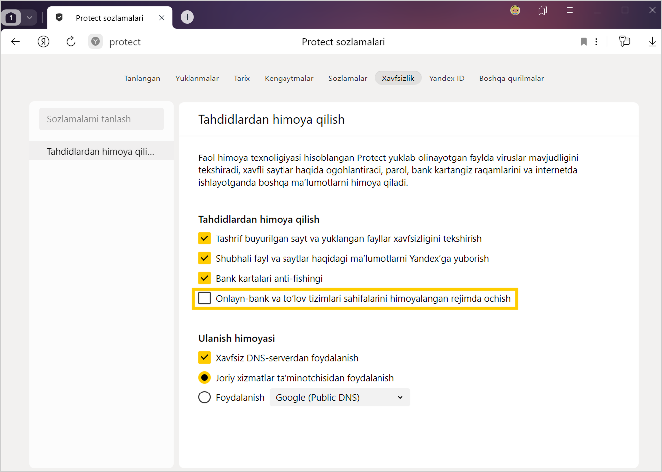 Brauzer himoyalangan rejimda Yandex parollar menejeridan tashqari barcha kengaytmalarni o‘z ichiga oladi. Bu to‘lov ma’lumotlaringizning zararli kengaytmalar tomonidan o‘g‘irlanishi yoki almashtirilishining oldini olish uchun amalga oshiriladi.