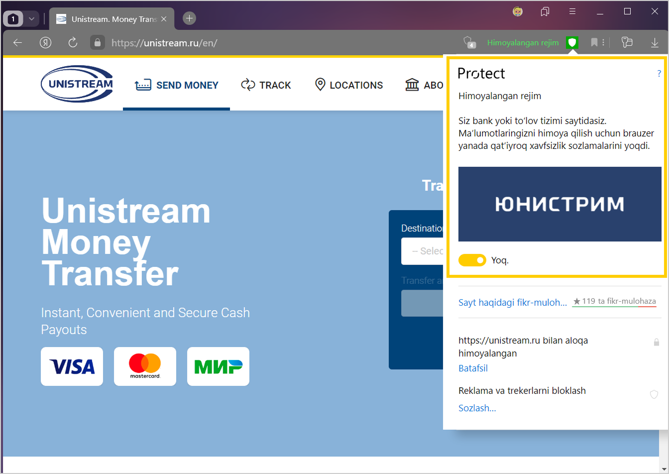 Agar siz onlayn to‘lov sahifasini ochsangiz va interfeys o‘zgarishini ko‘rmasangiz, himoyalangan rejimni majburiy ravishda yoqing.