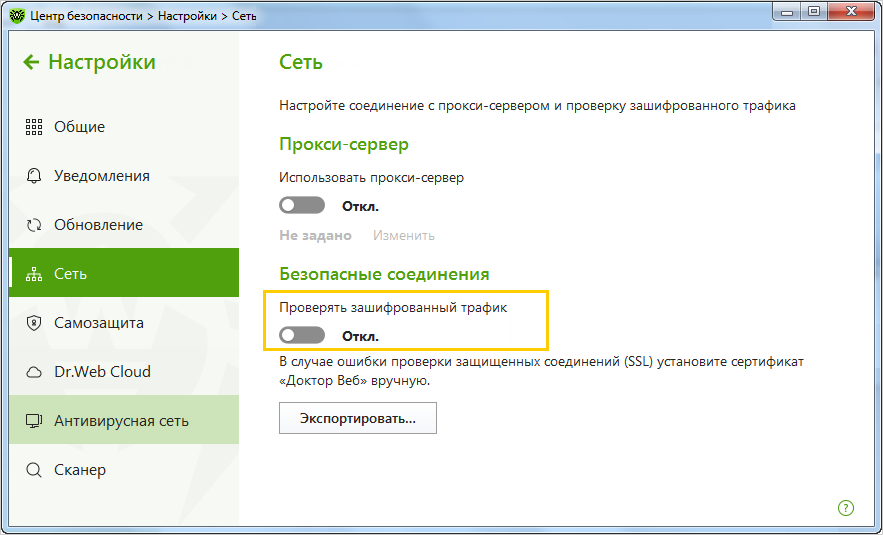 Dr Web antivirusi uchun HTTPS ulanishlar tekshiruvini faolsizlantiring