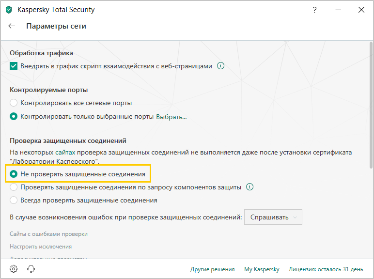Kasperskiy antivirusi uchun HTTPS ulanishlar tekshiruvini o‘chirish