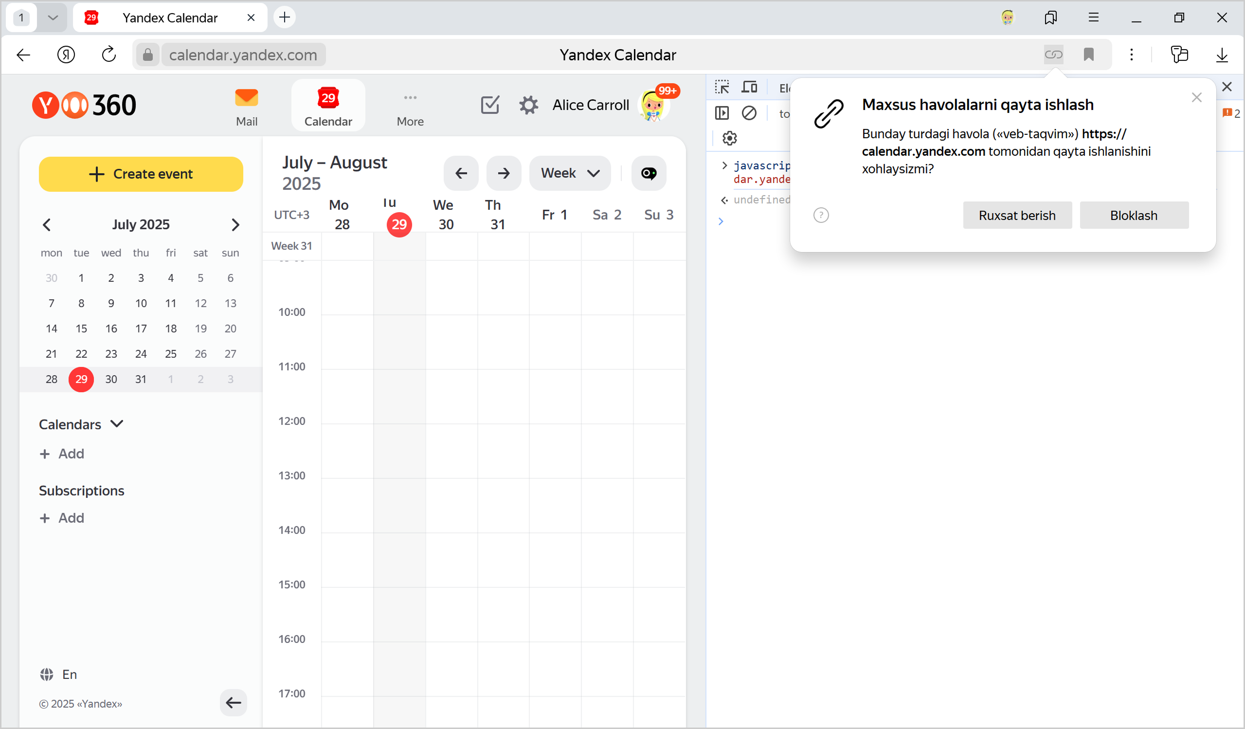 Agar Aqlli satrning o‘ng tomonida belgisi bo‘lmasa, JavaScript konsoli yordamida Yandex Pochtani qayta ishlovchi sifatida tayinlang: